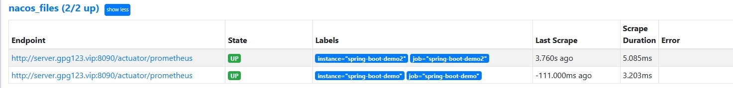 重启Prometheus,再nacos的Prometheus命名空间下添加.json文件,查看Prometheus面板Status->Targets,观察是否生效